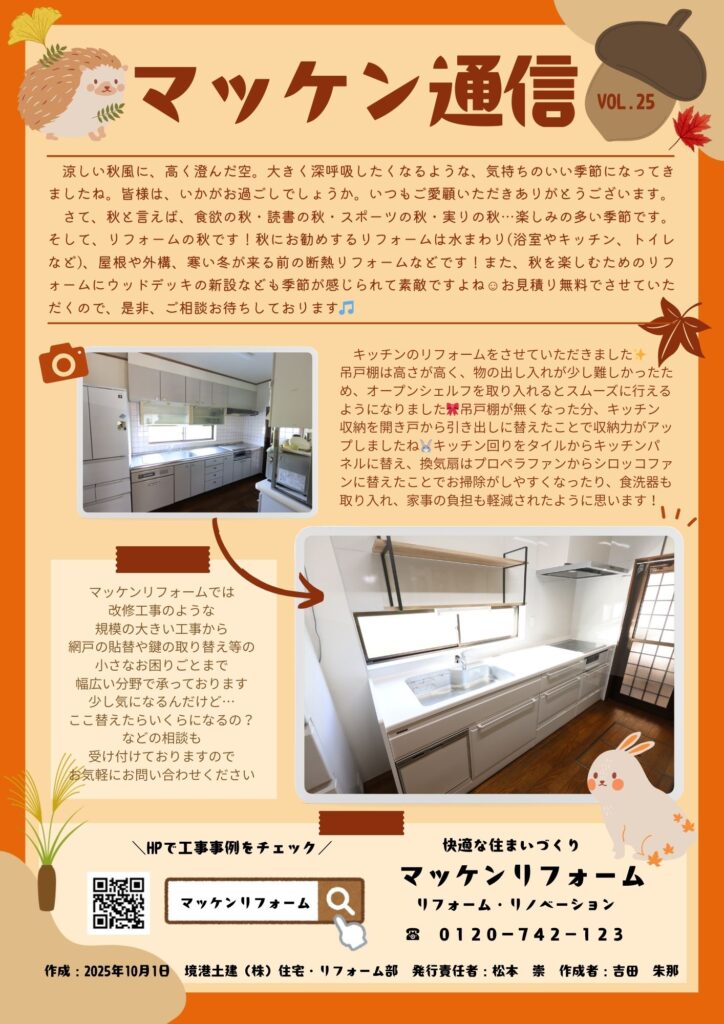 夏が終わり、秋の涼しさを感じる季節となりましたね🍁マッケン通信VOL.25を発行いたしました。今回は境港市のK様邸のキッチンリフォームについて紹介させていただきました!是非ご一読ください🌷