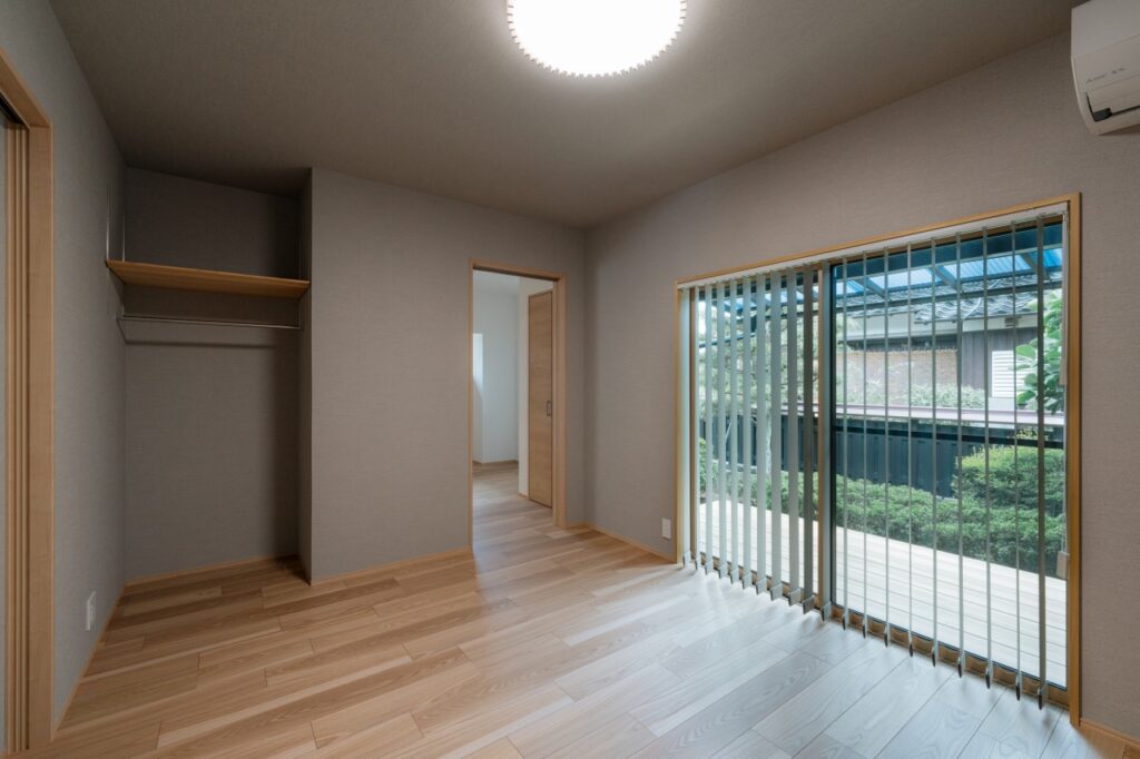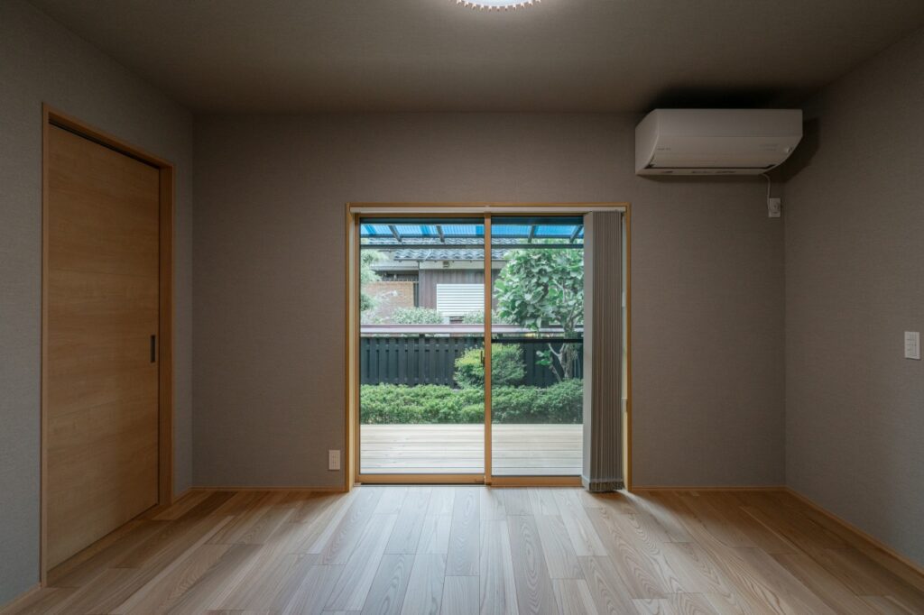 Afterでは昔ながらの和室がオシャレな寝室に生まれ変わりました。 窓は2枚建の掃き出し窓にし、ブラインドを設けました。 外にはウッドデッキを設けています。 照明もこだわって選んでいただきました。