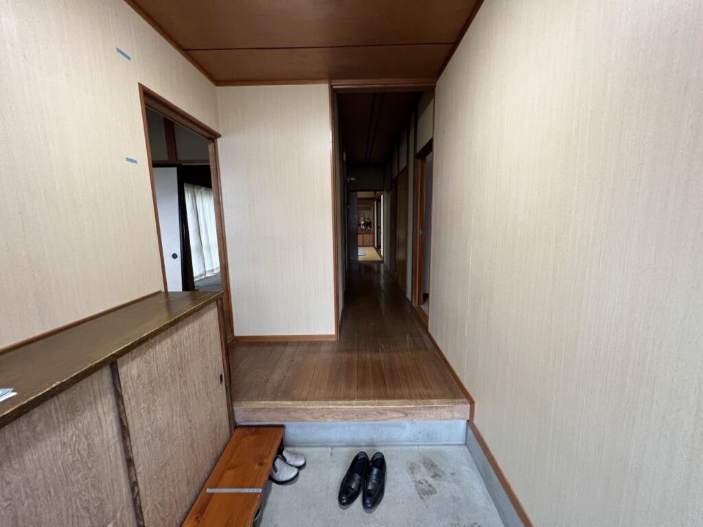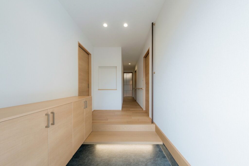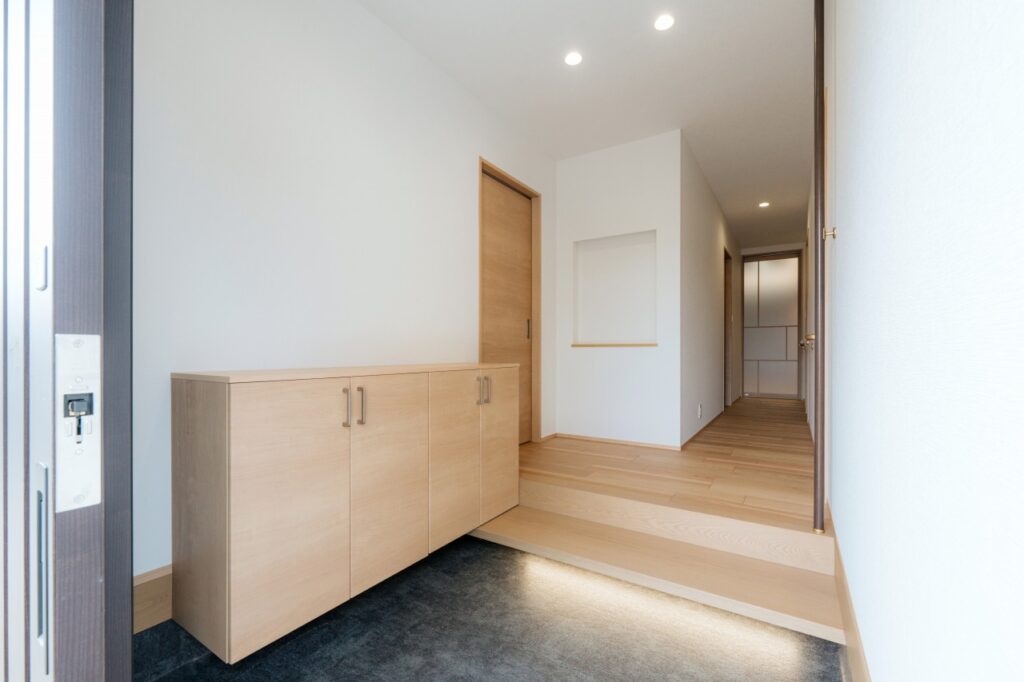 玄関ホールの左側には靴、玄関の小物が収納出来るように玄関収納を設けました。 玄関の段差が上がりやすいように、式台と縦型手摺を設けました。式台下にはオシャレな間接照明を取り付けています。 正面には絵画を飾るニッチを設けました。素敵な玄関でお客さんをお出迎え出来るようになりました。