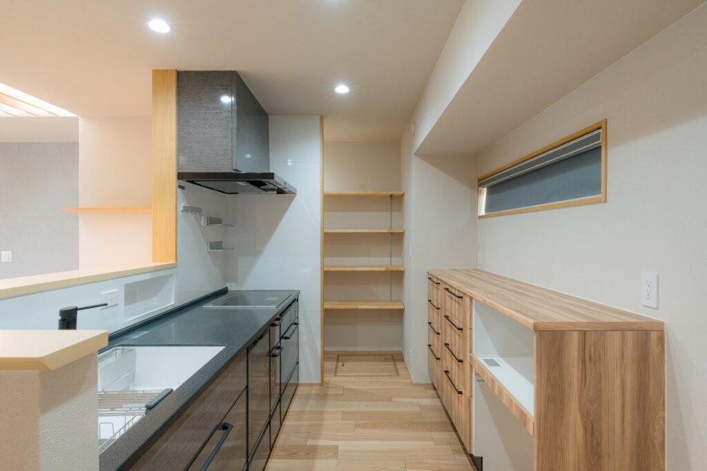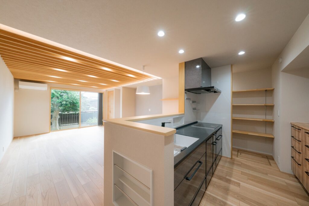 元々は昔ながらの和室2部屋と広縁がありました。お客様のご希望で和室2部屋と広縁を1部屋にし、対面キッチンを設けました。また、押入部分を活用してパントリーを設けました。パントリーを広くとったのでキッチンの道具を綺麗に収納できます。 天井にはルーバーを取り付け、間接照明を設置しました。休日は掃き出し窓から綺麗な庭を見てリラックスできますね。
