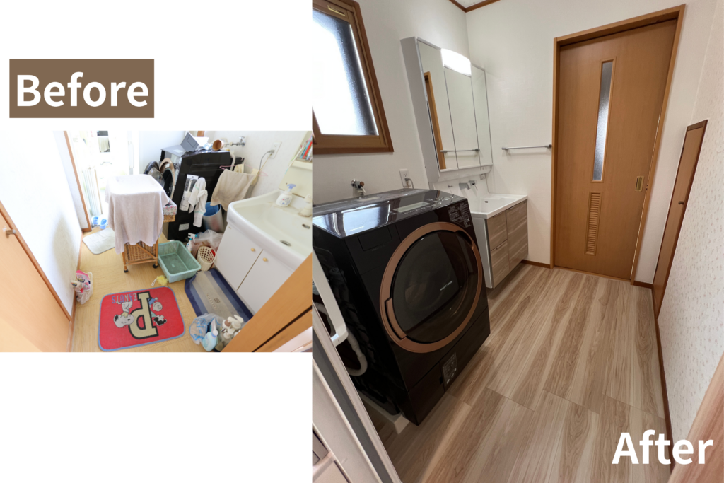 間仕切り壁を撤去・新設し内窓を取付け、洗面化粧台取替・床貼替・クロス貼替を行いました。